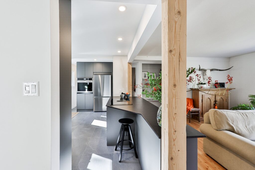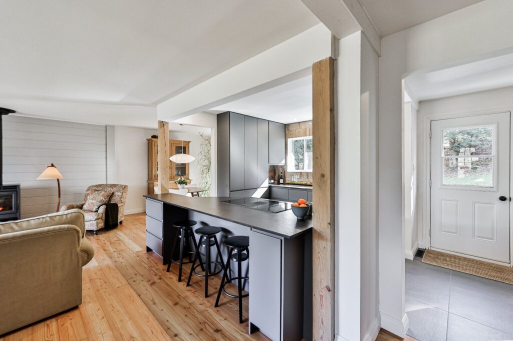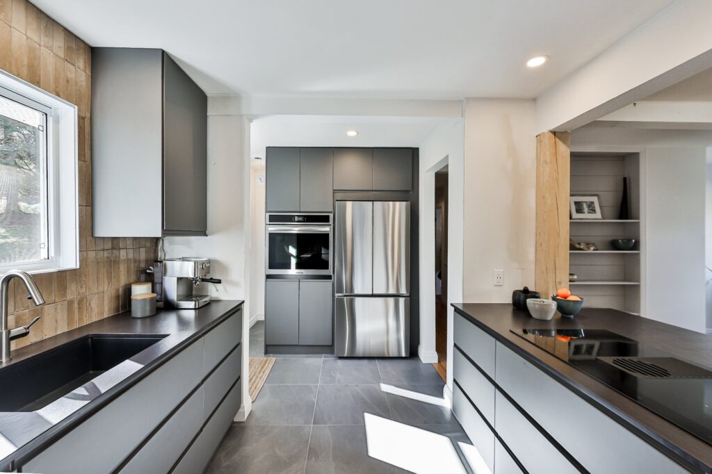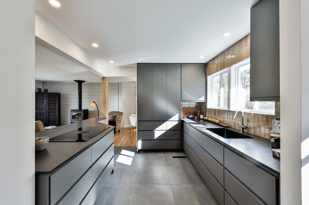 La cuisine, à la fois moderne et ultra fonctionnelle, inclut tous les électroménagers pour un quotidien simplifié.