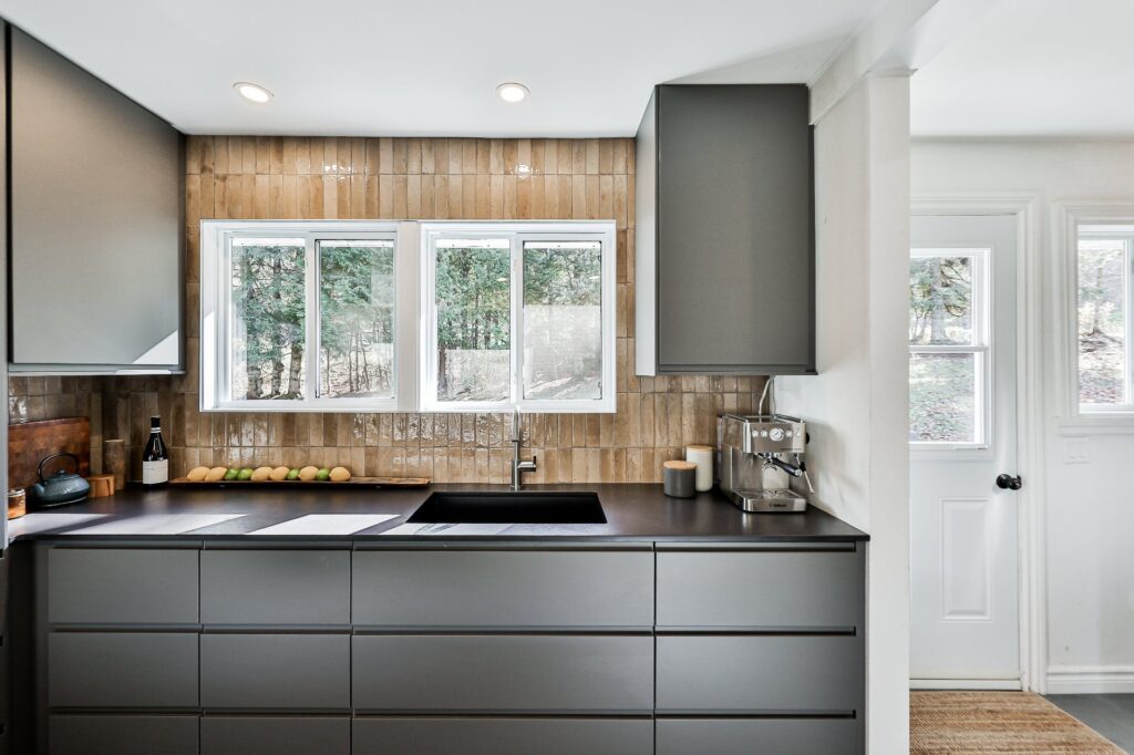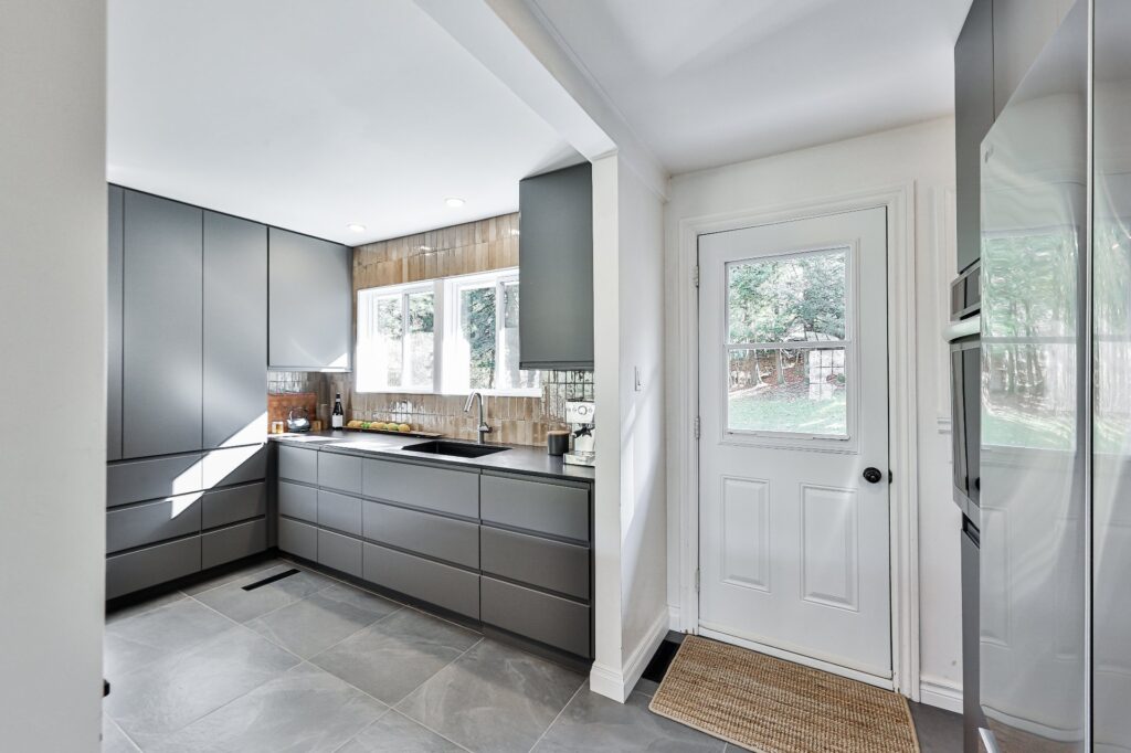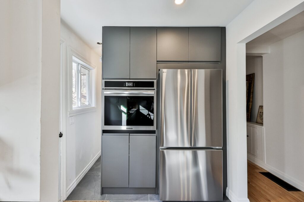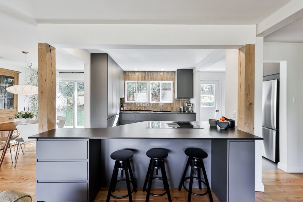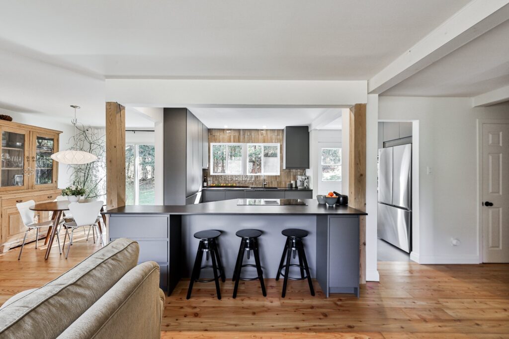 La cuisine, à la fois moderne et ultra fonctionnelle, inclut tous les électroménagers pour un quotidien simplifié.