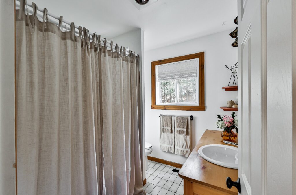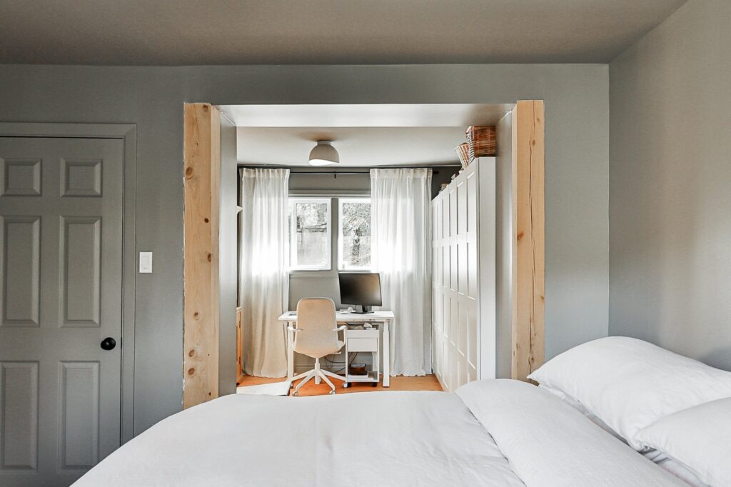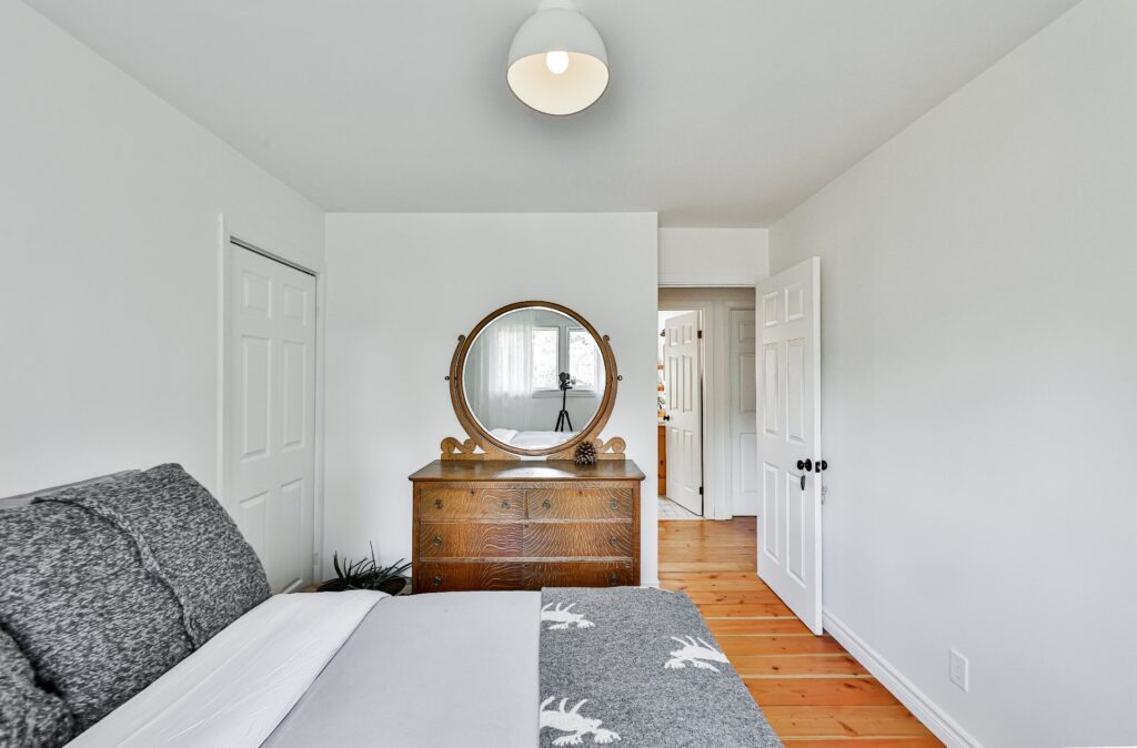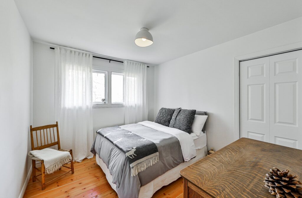 Initialement conçue avec trois chambres, la résidence a été réaménagée pour créer une chambre des maîtres avec un bel espace de rangement ainsi qu'un coin de travail. Une salle de bain complète se trouve au même niveau.