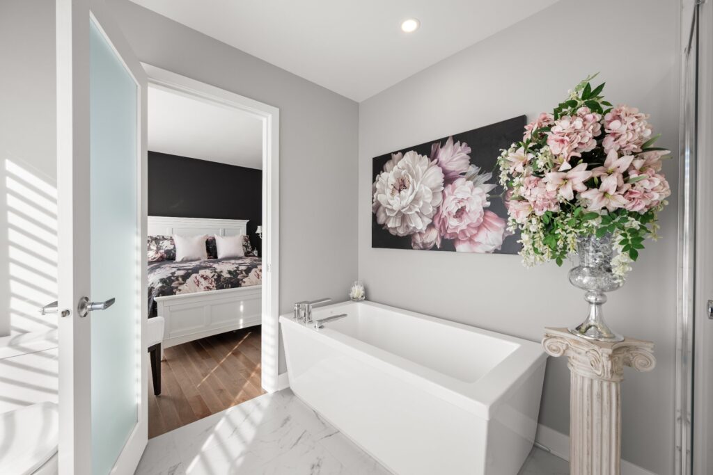 À l'étage, la propriété offre trois chambres, dont une suite principale avec salle de bain attenante, comprenant baignoire, douche indépendante et walk-in avec mobilier sur mesure, en plus d'une deuxième salle de bain complète.