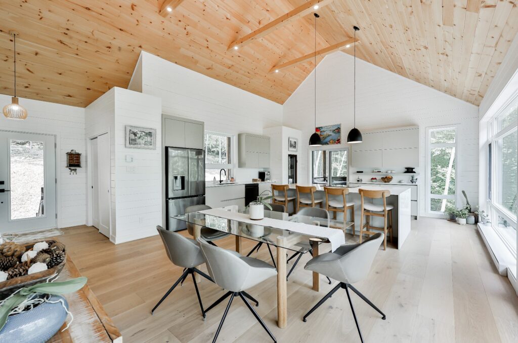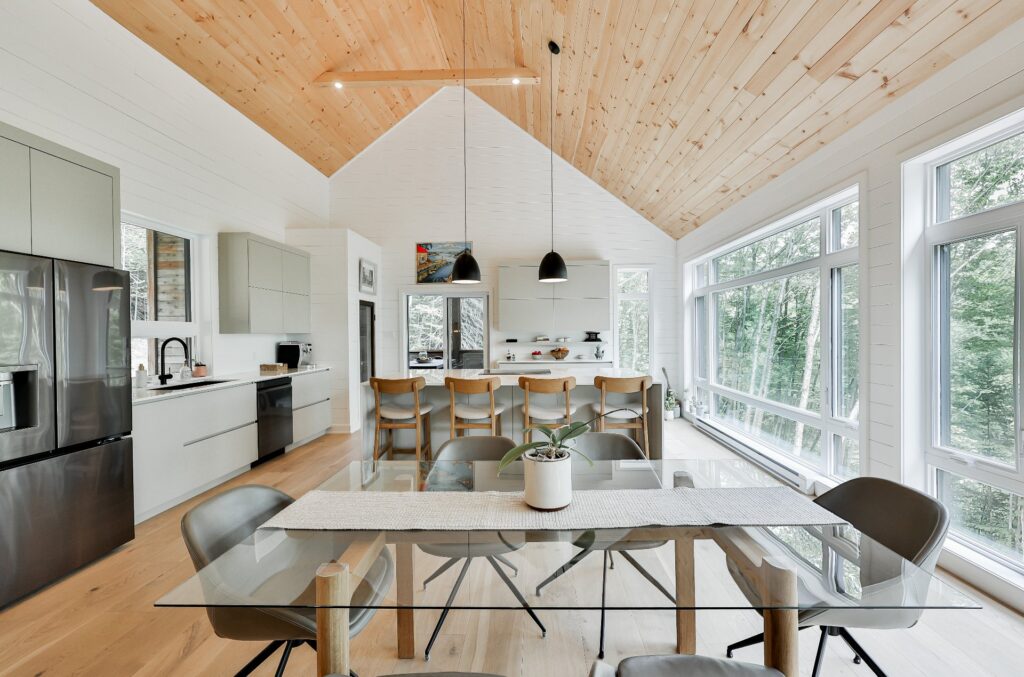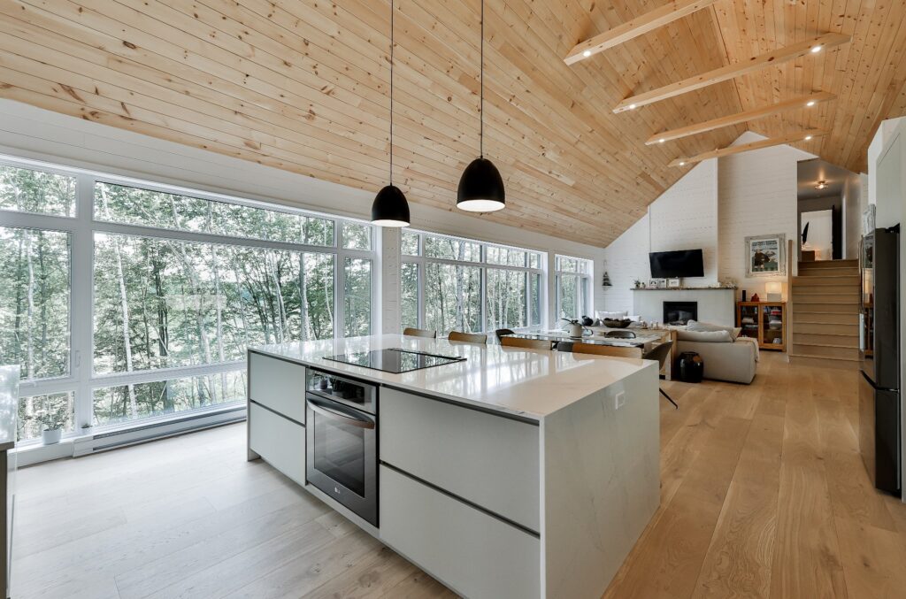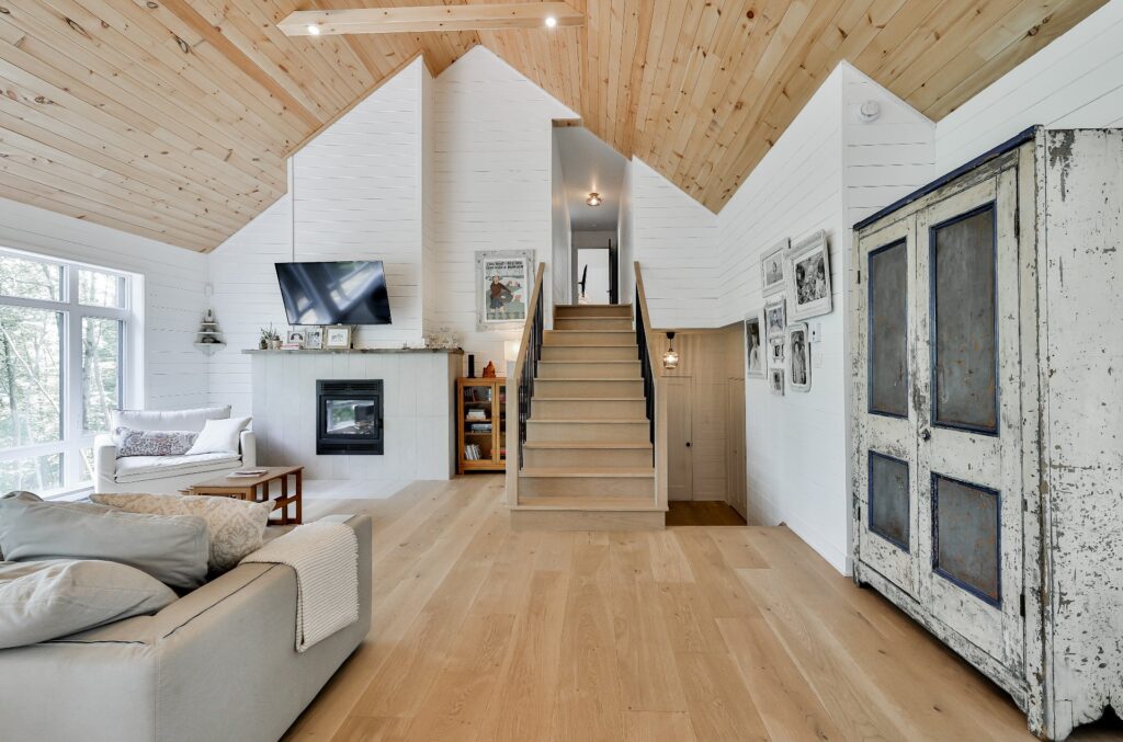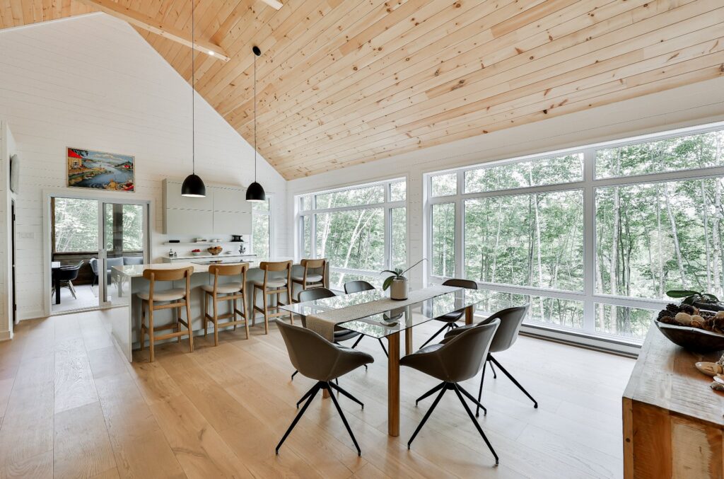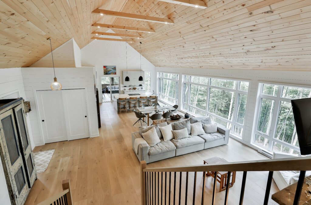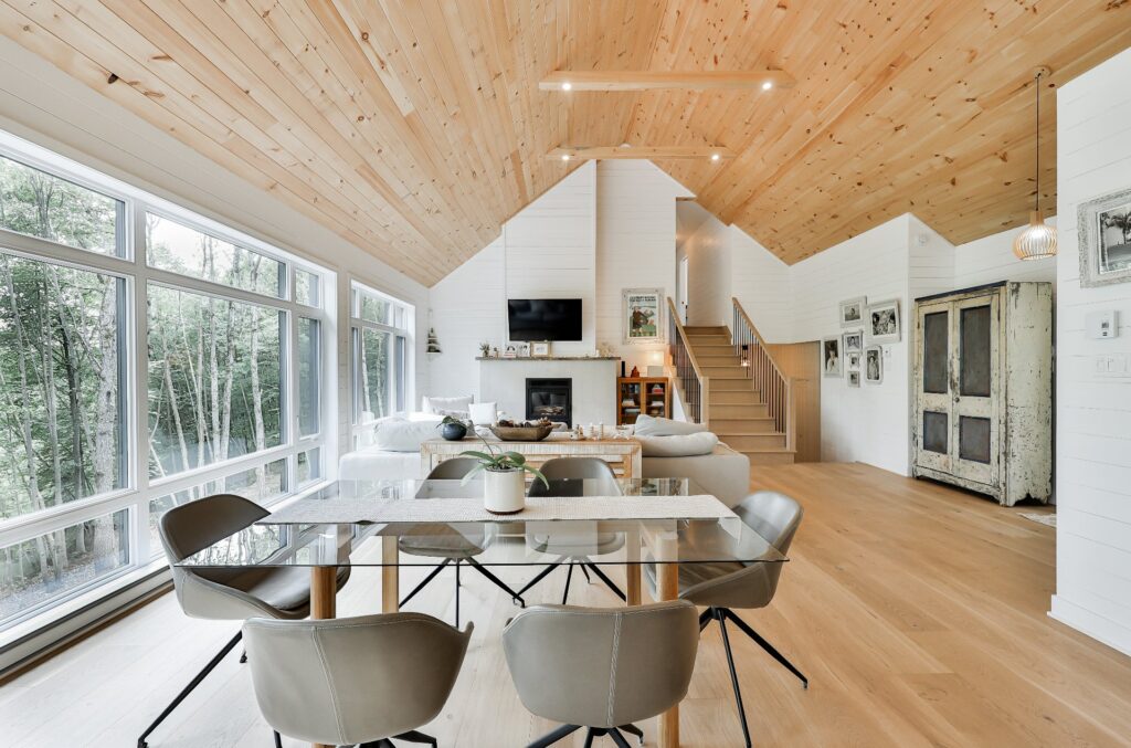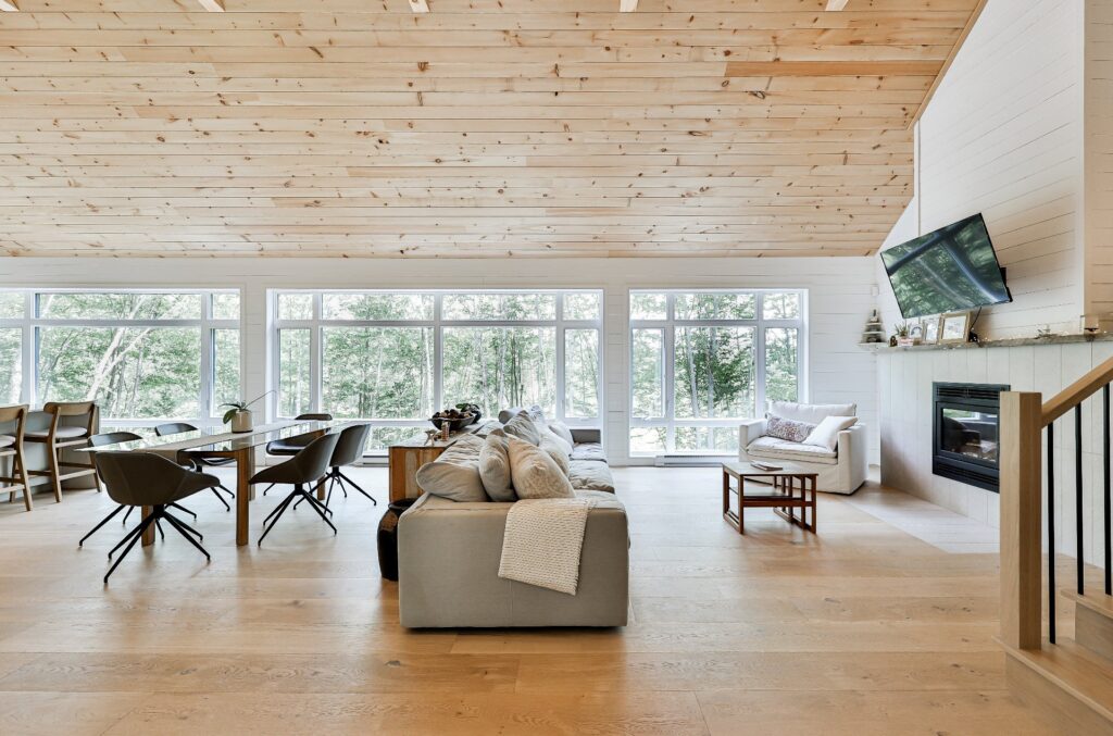 L'espace de vie principal, situé au rez-de-chaussée, est entièrement à aire ouverte. Peu importe où vous vous trouvez, la vue sur la nature environnante reste omniprésente grâce à une fenestration généreuse. Les murs en bois blanc apportent une touche à la fois rustique et élégante, créant une atmosphère apaisante et chaleureuse.