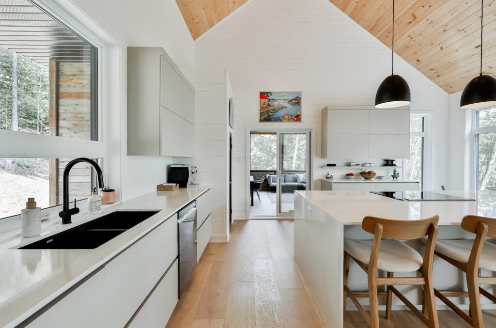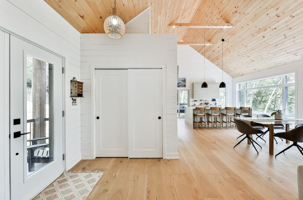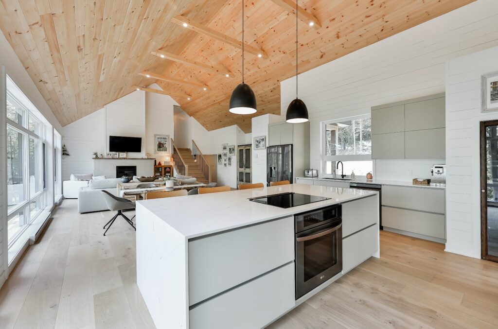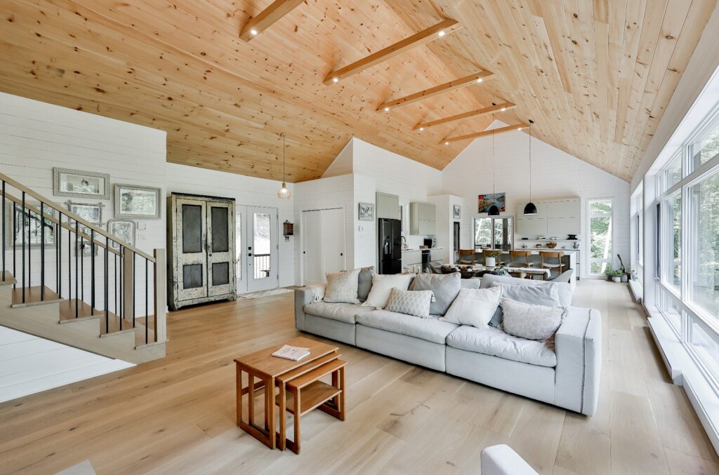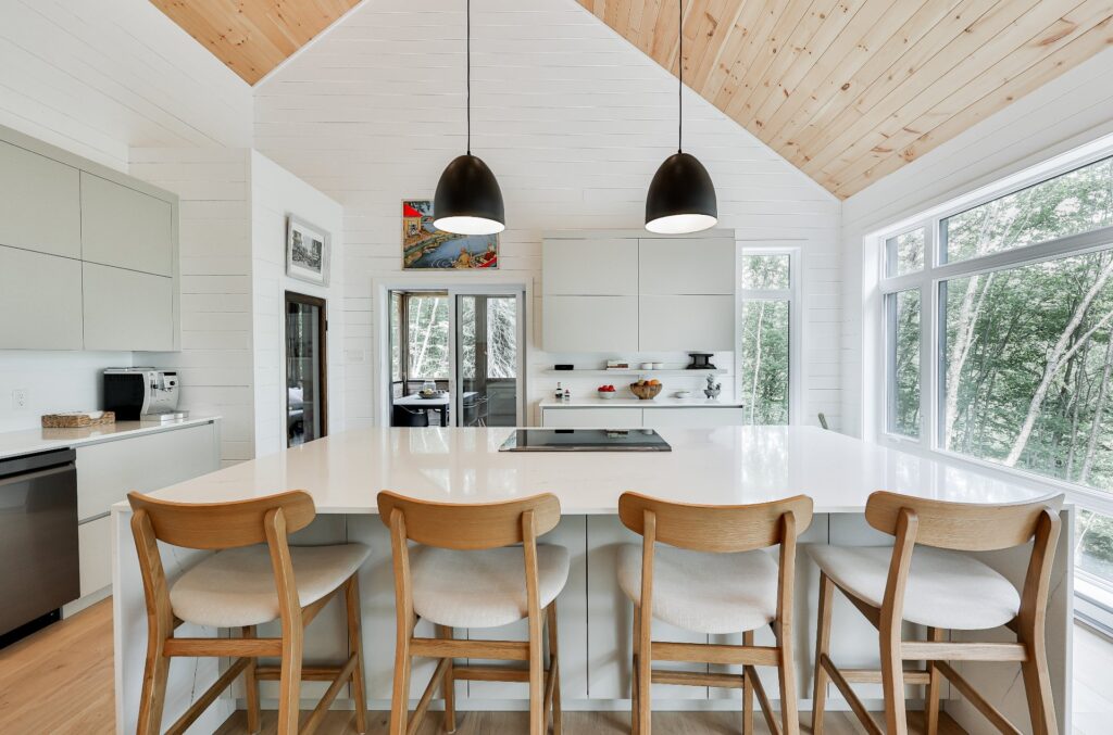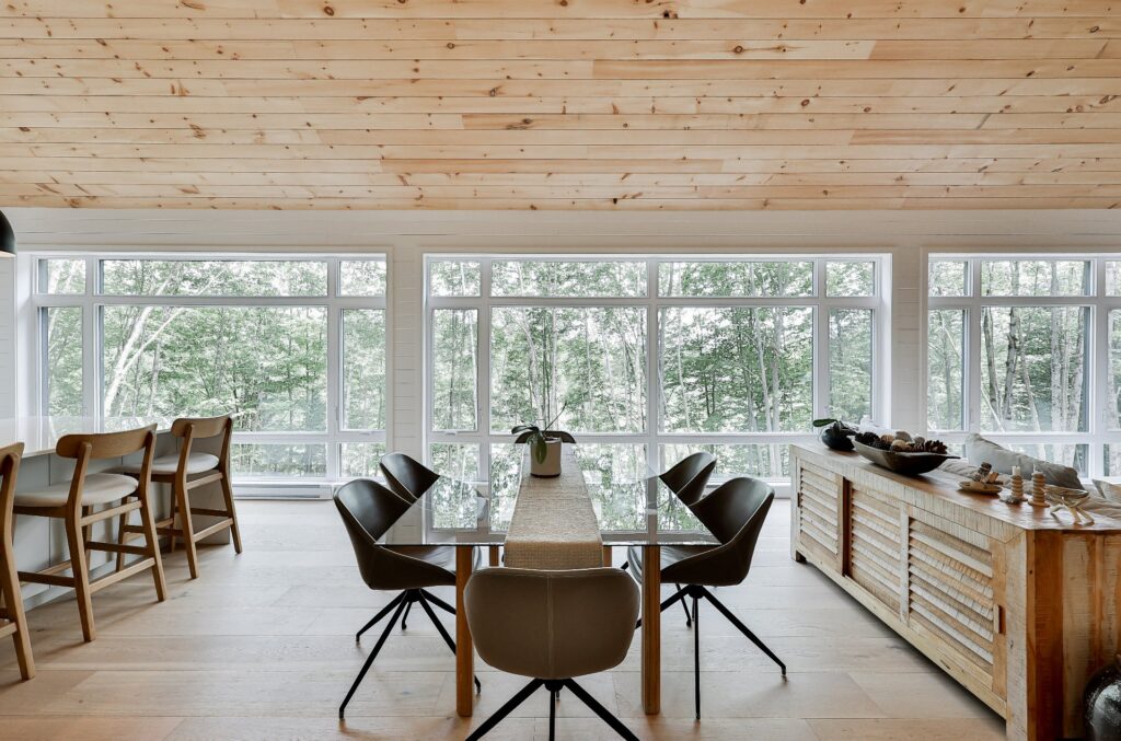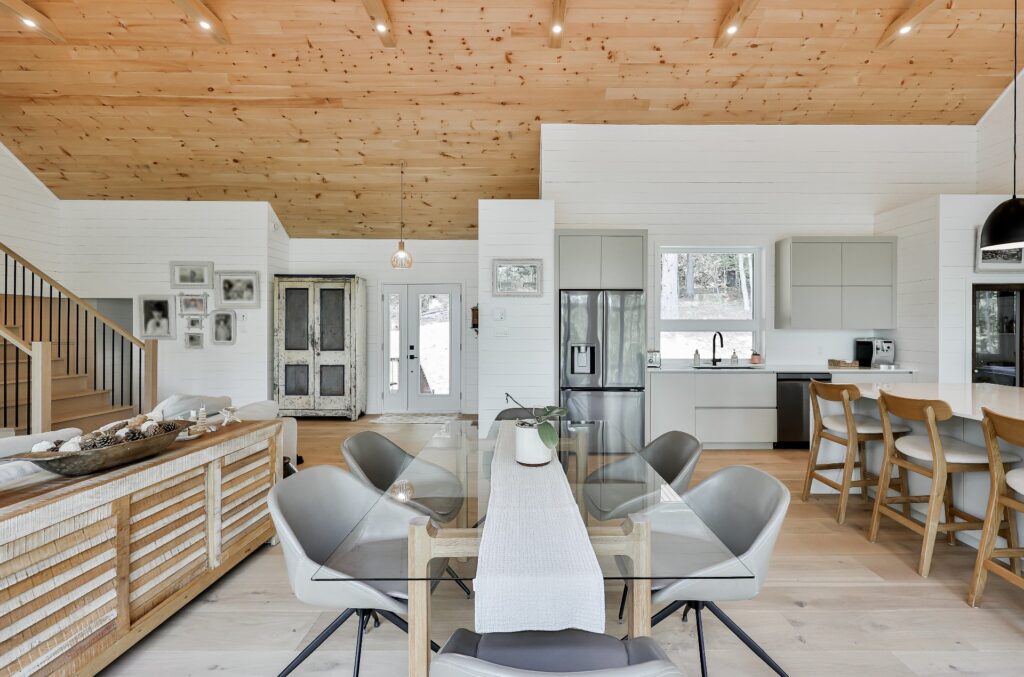 L'espace de vie principal, situé au rez-de-chaussée, est entièrement à aire ouverte. Peu importe où vous vous trouvez, la vue sur la nature environnante reste omniprésente grâce à une fenestration généreuse. Les murs en bois blanc apportent une touche à la fois rustique et élégante, créant une atmosphère apaisante et chaleureuse.
