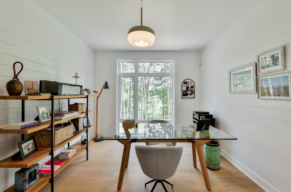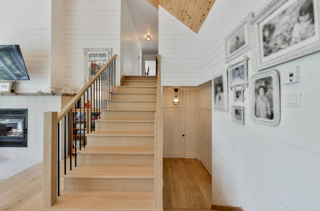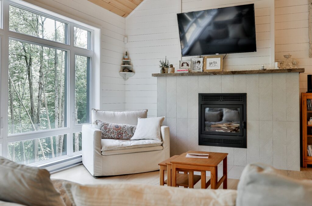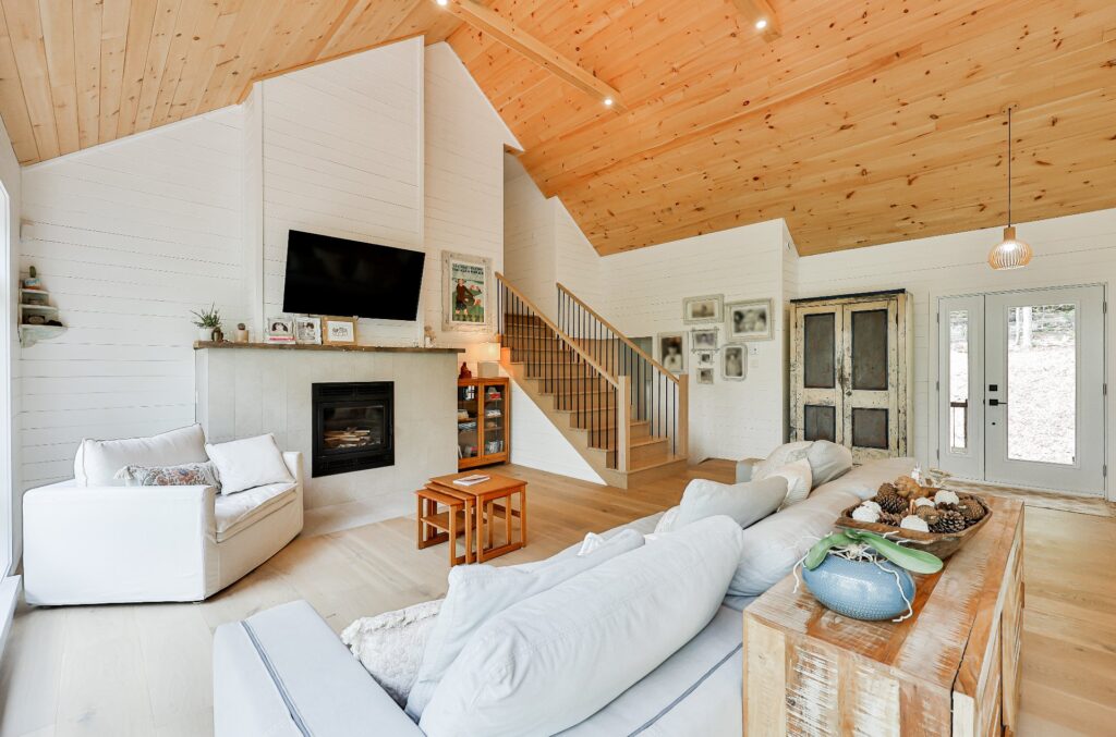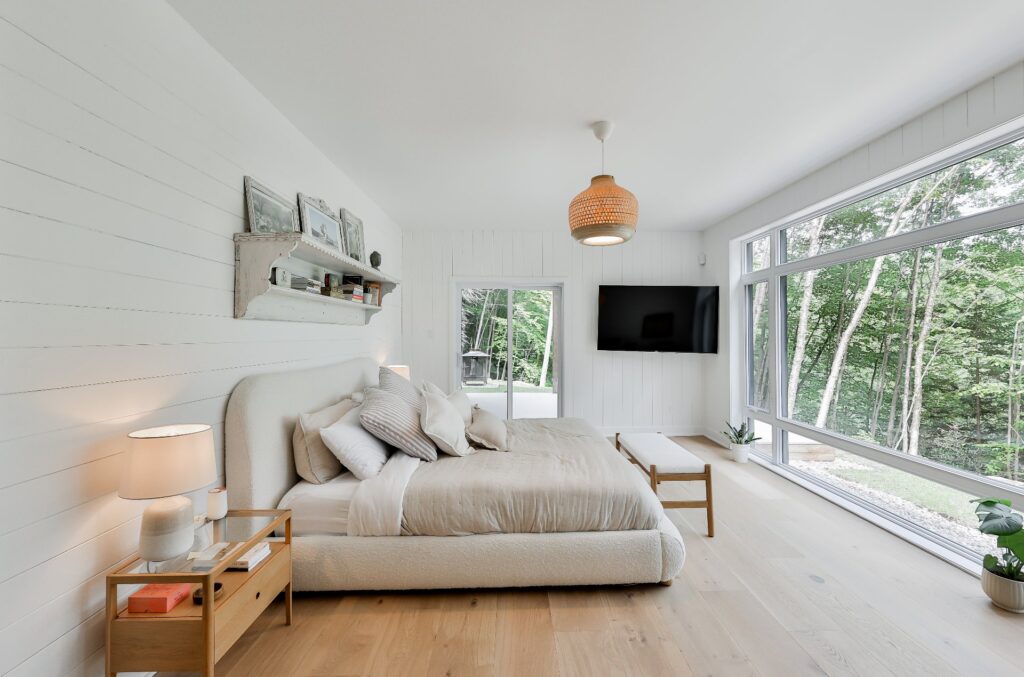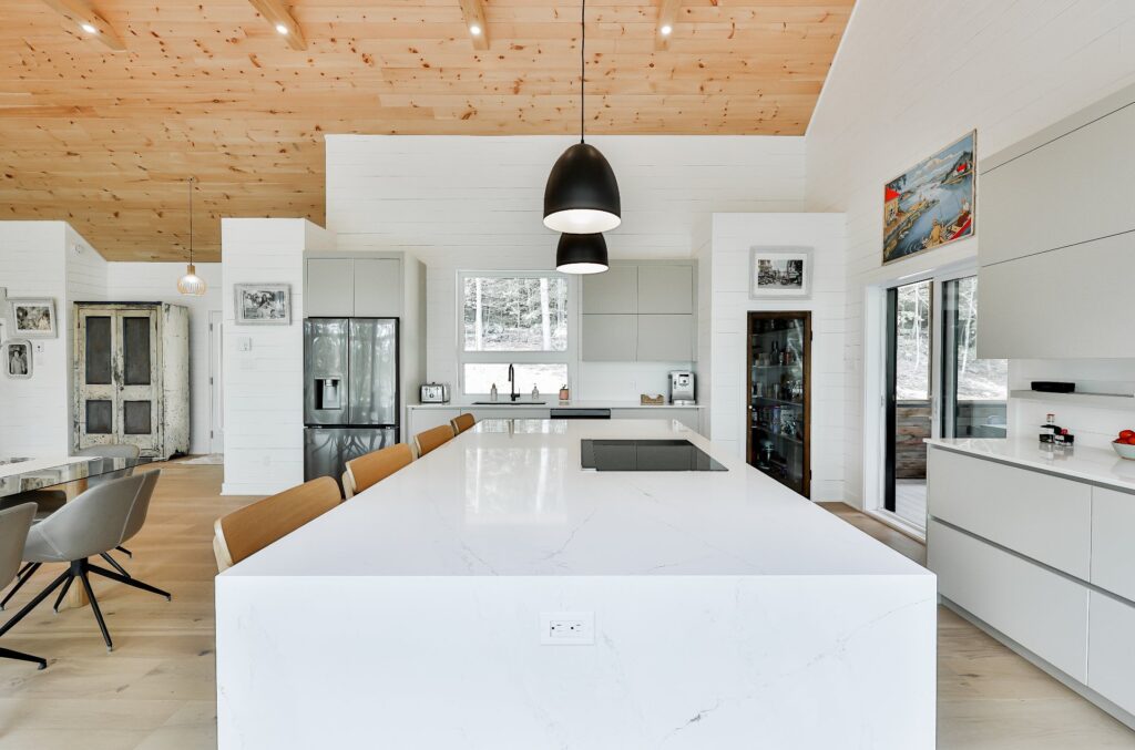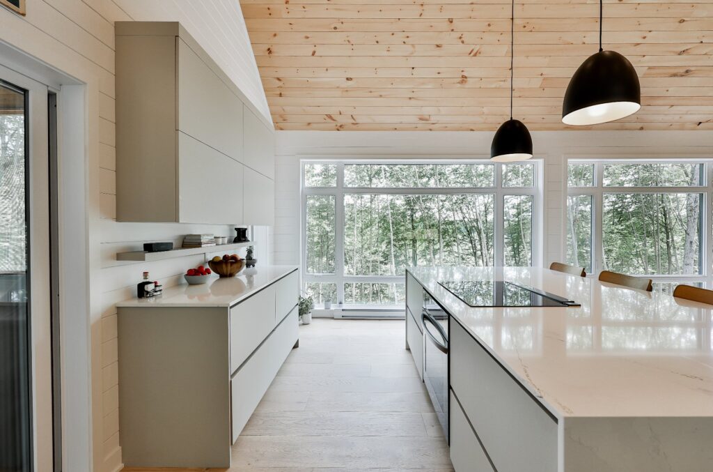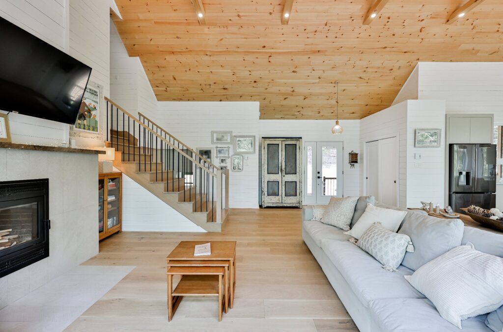 L'espace de vie principal, situé au rez-de-chaussée, est entièrement à aire ouverte. Peu importe où vous vous trouvez, la vue sur la nature environnante reste omniprésente grâce à une fenestration généreuse. Les murs en bois blanc apportent une touche à la fois rustique et élégante, créant une atmosphère apaisante et chaleureuse.