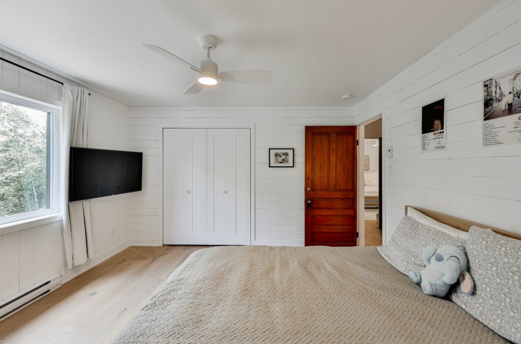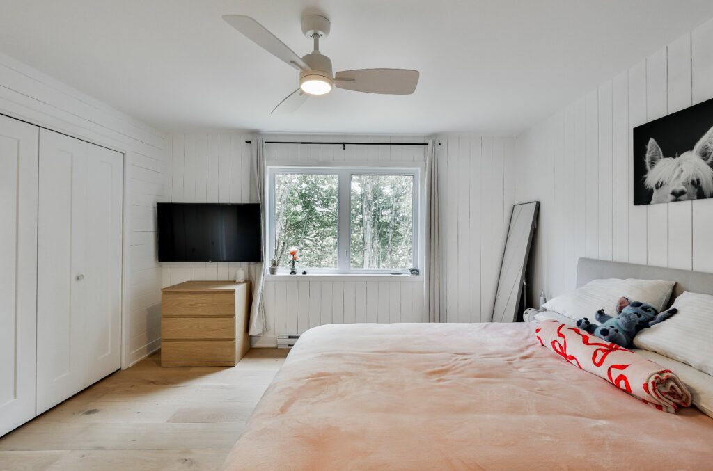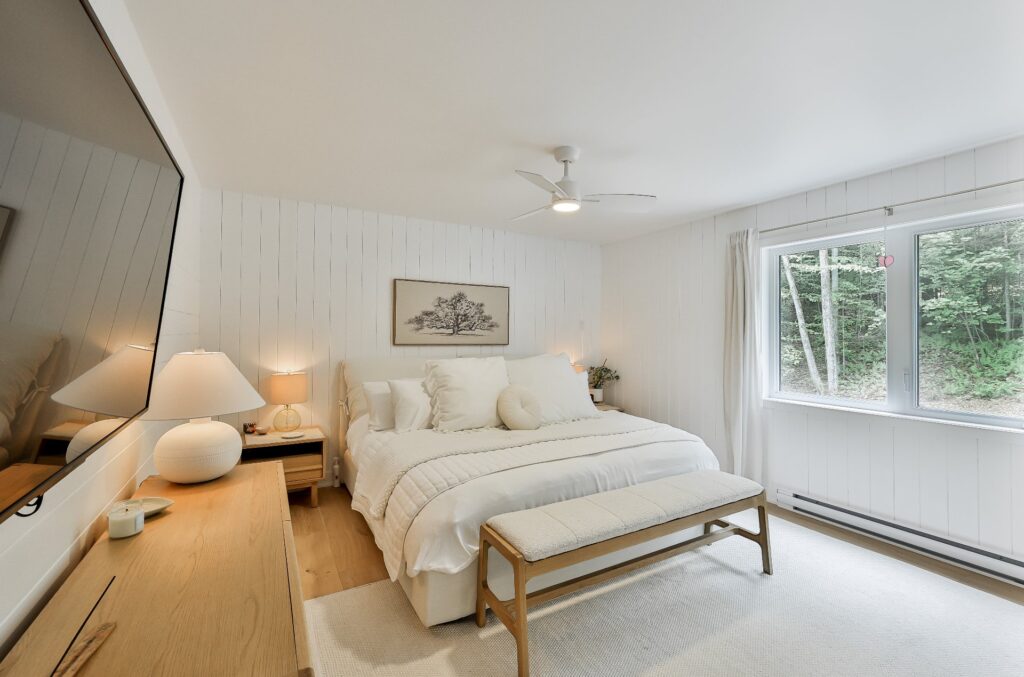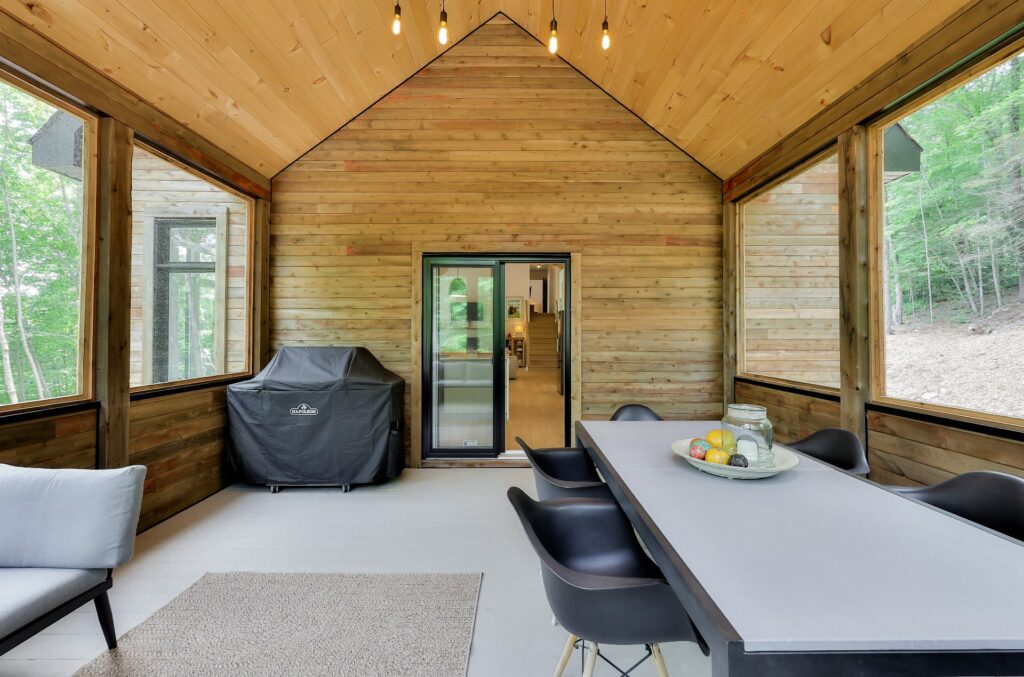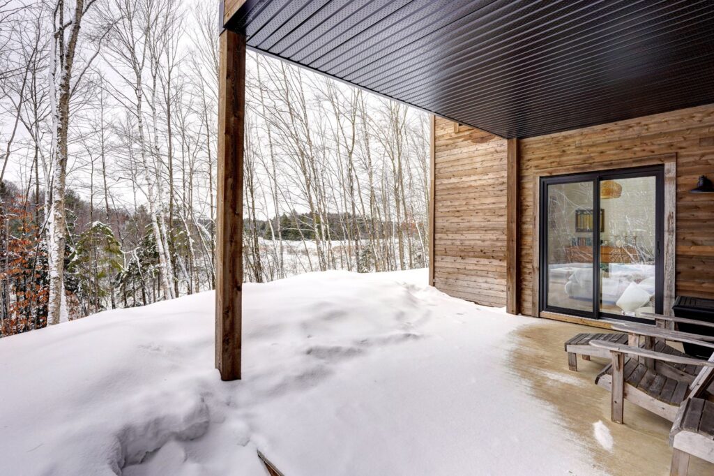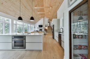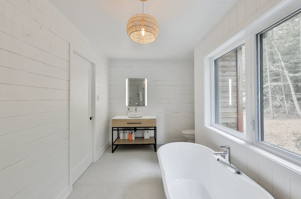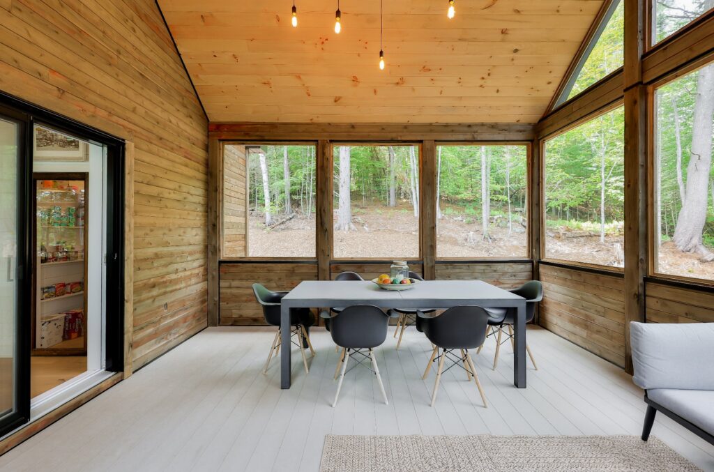 L'espace de vie principal, situé au rez-de-chaussée, est entièrement à aire ouverte. Peu importe où vous vous trouvez, la vue sur la nature environnante reste omniprésente grâce à une fenestration généreuse. Les murs en bois blanc apportent une touche à la fois rustique et élégante, créant une atmosphère apaisante et chaleureuse.