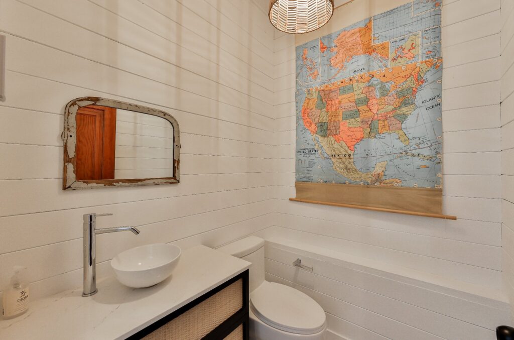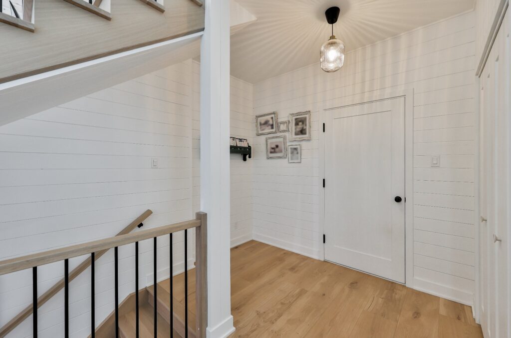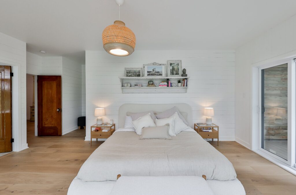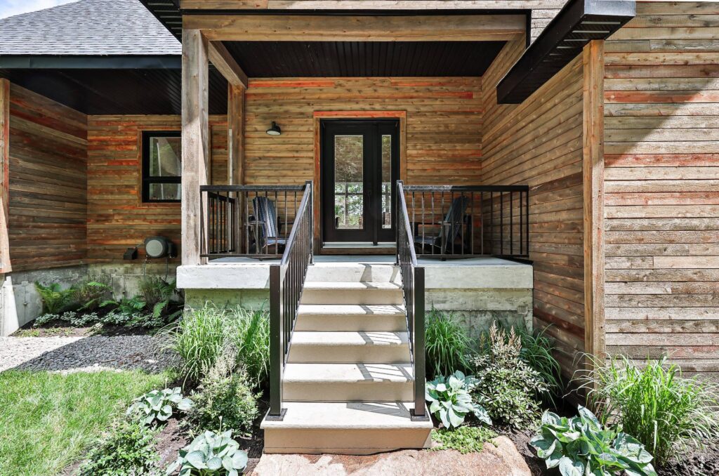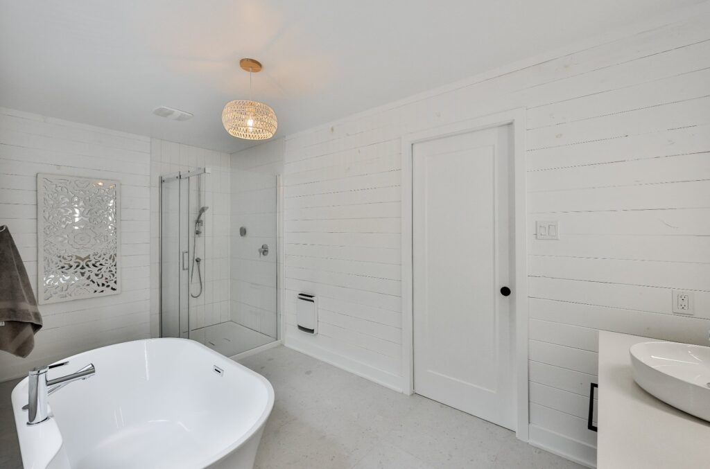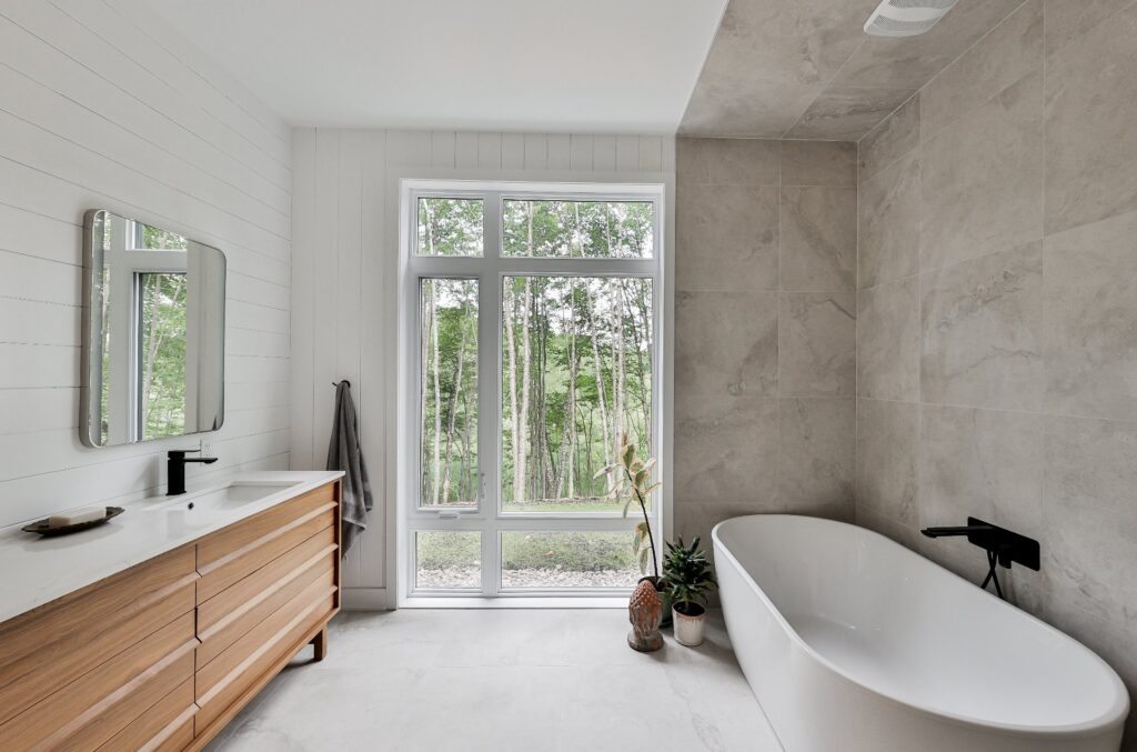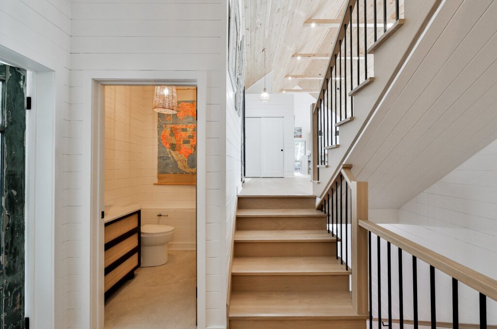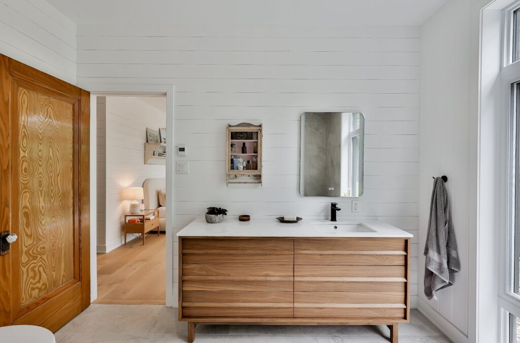 L'espace de vie principal, situé au rez-de-chaussée, est entièrement à aire ouverte. Peu importe où vous vous trouvez, la vue sur la nature environnante reste omniprésente grâce à une fenestration généreuse. Les murs en bois blanc apportent une touche à la fois rustique et élégante, créant une atmosphère apaisante et chaleureuse.